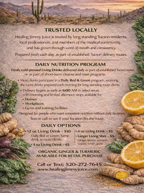 At Healing Jimmy Juice, we deliver structured, therapeutic nutrition—one bottle at a time. Our family of juicers includes Norwalk and Pure hydraulic “Gerson Approved“ machines along with the old school Omega, and NAMA J2 systems, allowing us to cold-press organic vegetables at the highest level of enzyme and nutrient preservation. Rising at 2:30 a.m., we specialize in early-morning fresh deliveries and a Daily Nutrition Program designed to reduce inflammation, support digestion, stabilize energy, and nourish the body at a cellular level. This is not mass-produced juice—it is purposeful, made-to-order nutrition. Call, text, or email now to get started and secure early delivery availability.