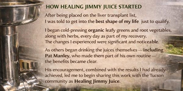 Healing Jimmy Juice was created during my recovery from advanced liver disease, when my MELD score improved from 22 to 8